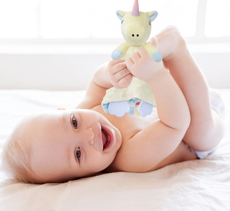 Peluche de coordination œil-main, Jouets interactifs et apaisant, composé d'anneau de dentition en silicone licorne
